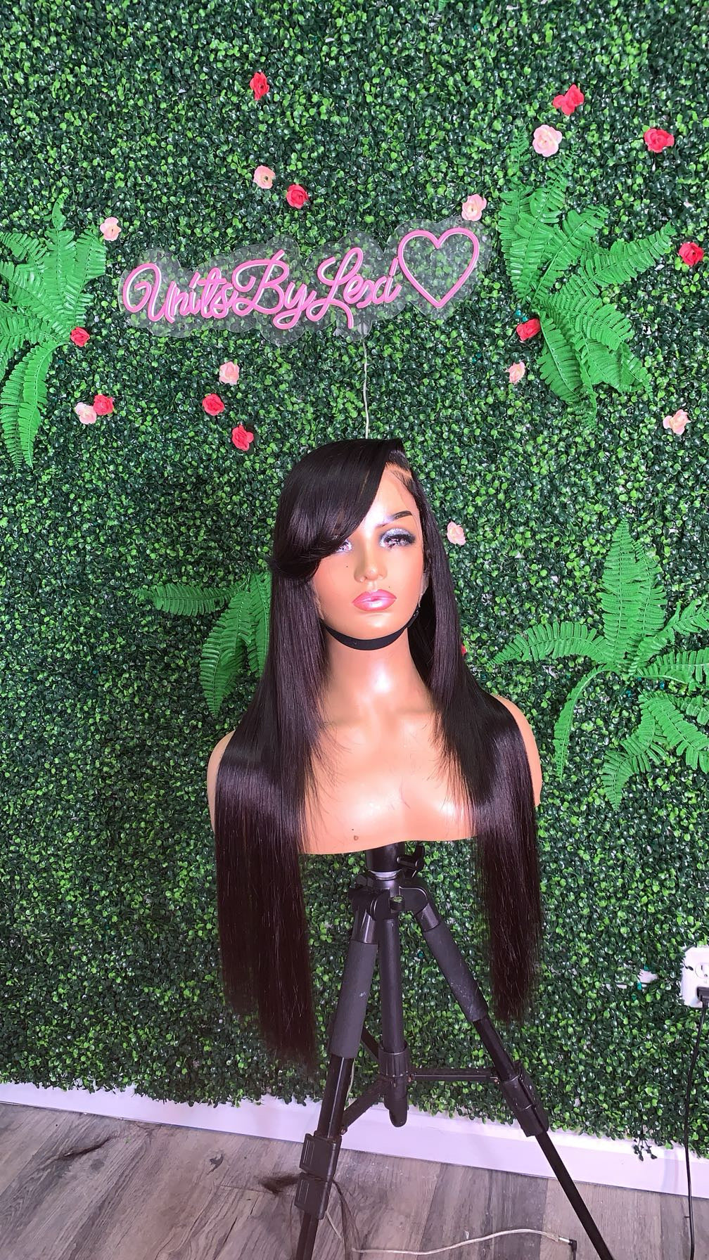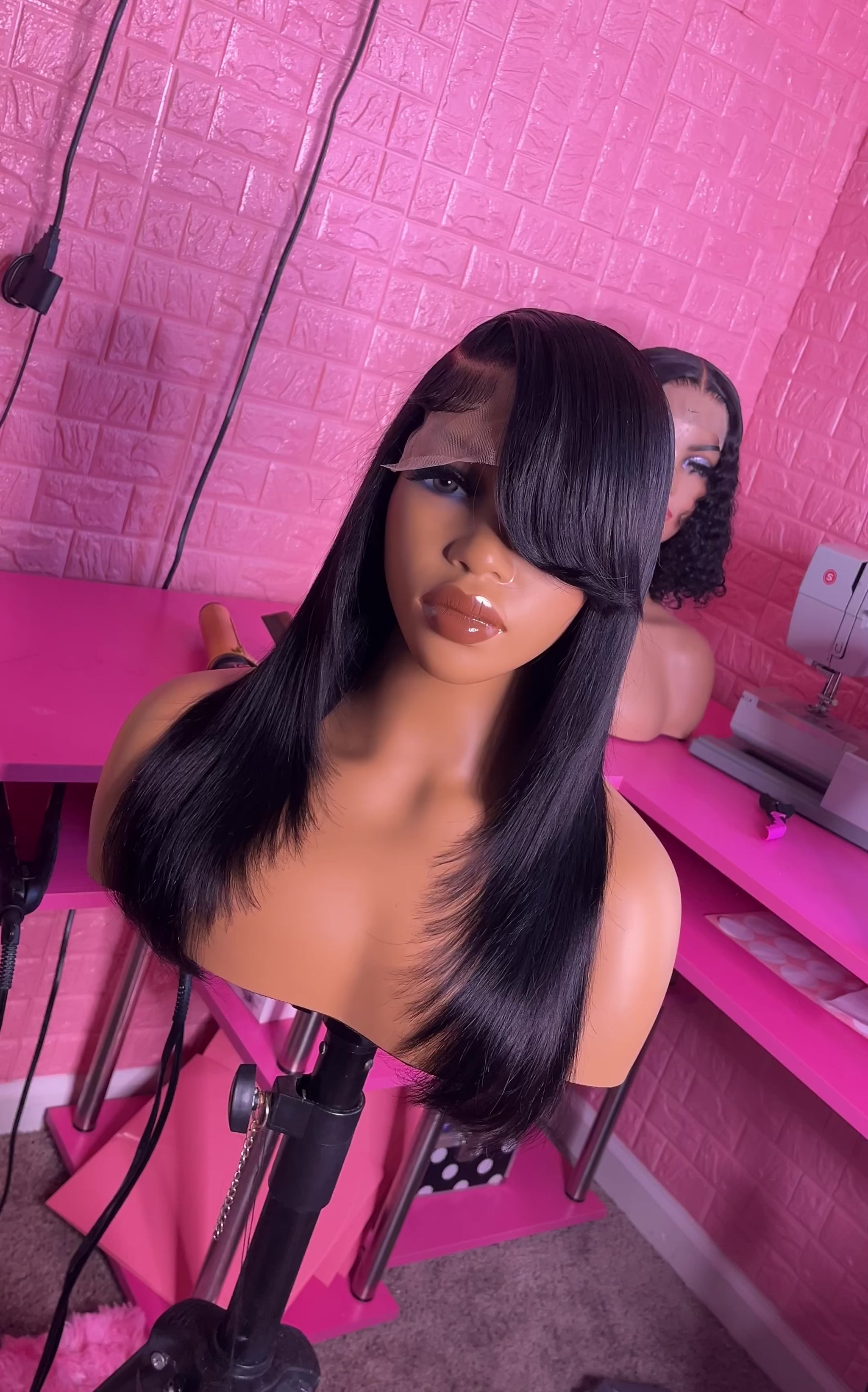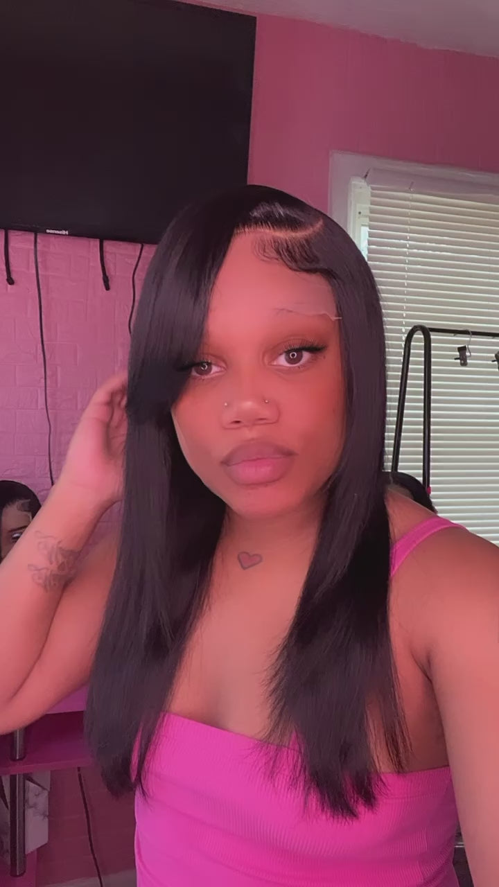 Originally 20”, layered all around with added bang, 5x5 TP lace closure, factory made, fully customized/ready to wear, can be worn GLUELESS