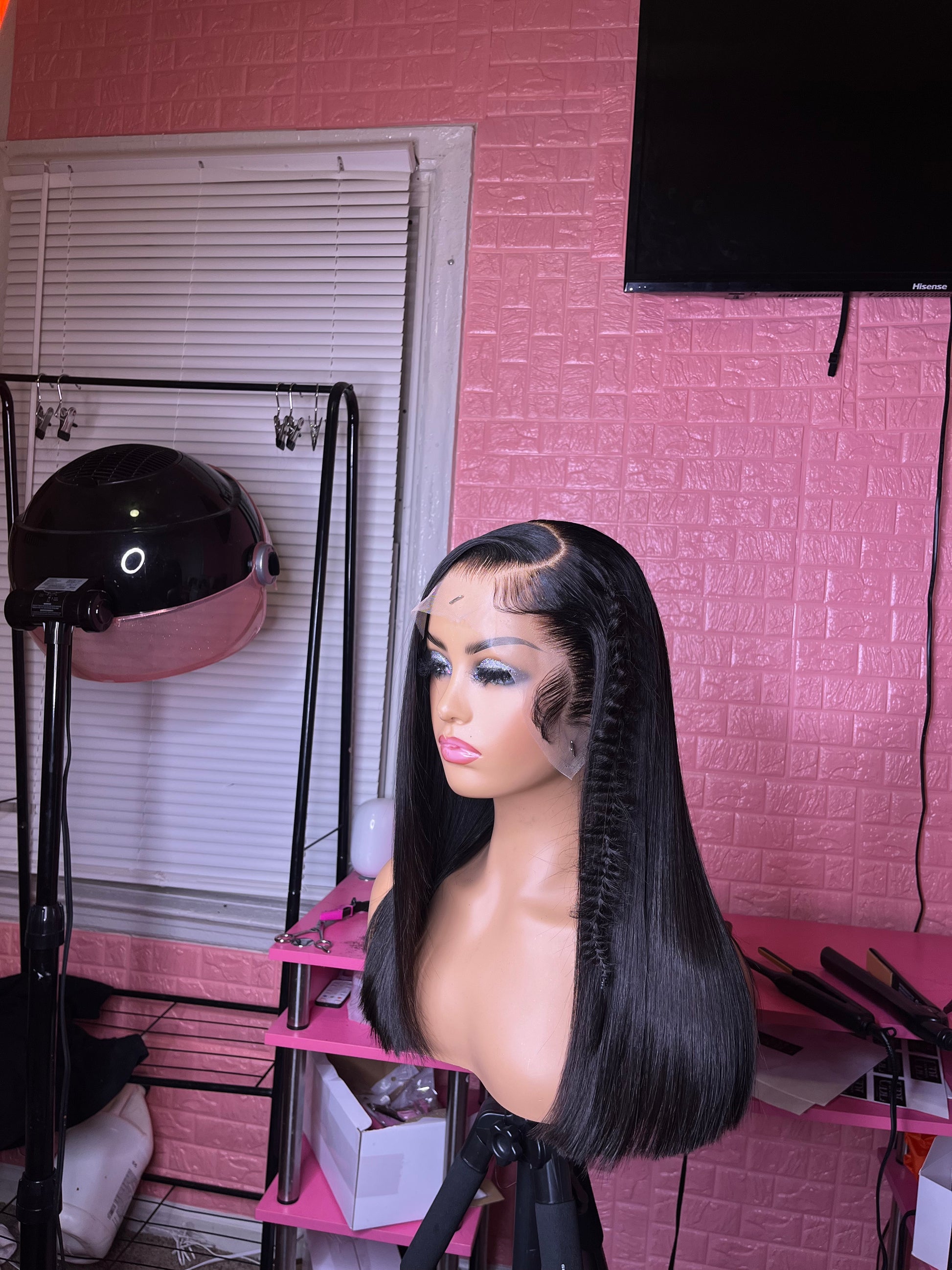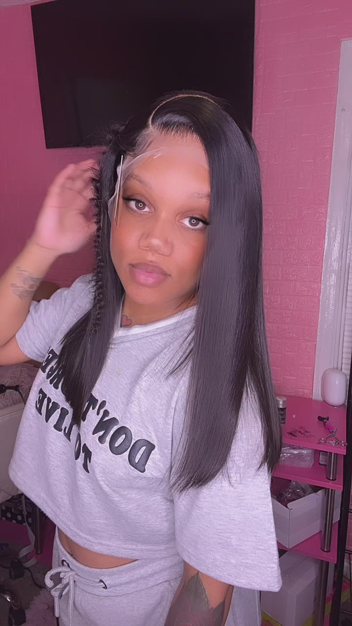 Originally 20” cut blunt, 180% density, 13x4 transparent lace, factory made, Glueless, adjustable band and clips, ready to wear